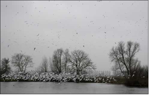 foto: Leonard Kers Sneeuw "Invallende duisternis, besneeuwde weilanden en ganzen die bij elkaar beschutting zoeken. De grijze kleuren met de donkere gestalten van de vogels maken duidelijk dat sneeuw niet alleen maar pret is." (L.K.) |